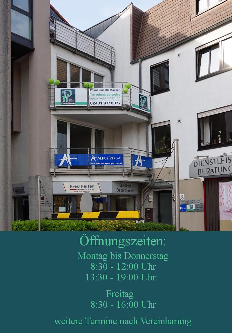 Die Physiotherapiepraxis in Erkelenz. Besuchen sie uns oder vereinbaren Sie auf Wunsch einen Termin bei Ihnen vor Ort.![]() |